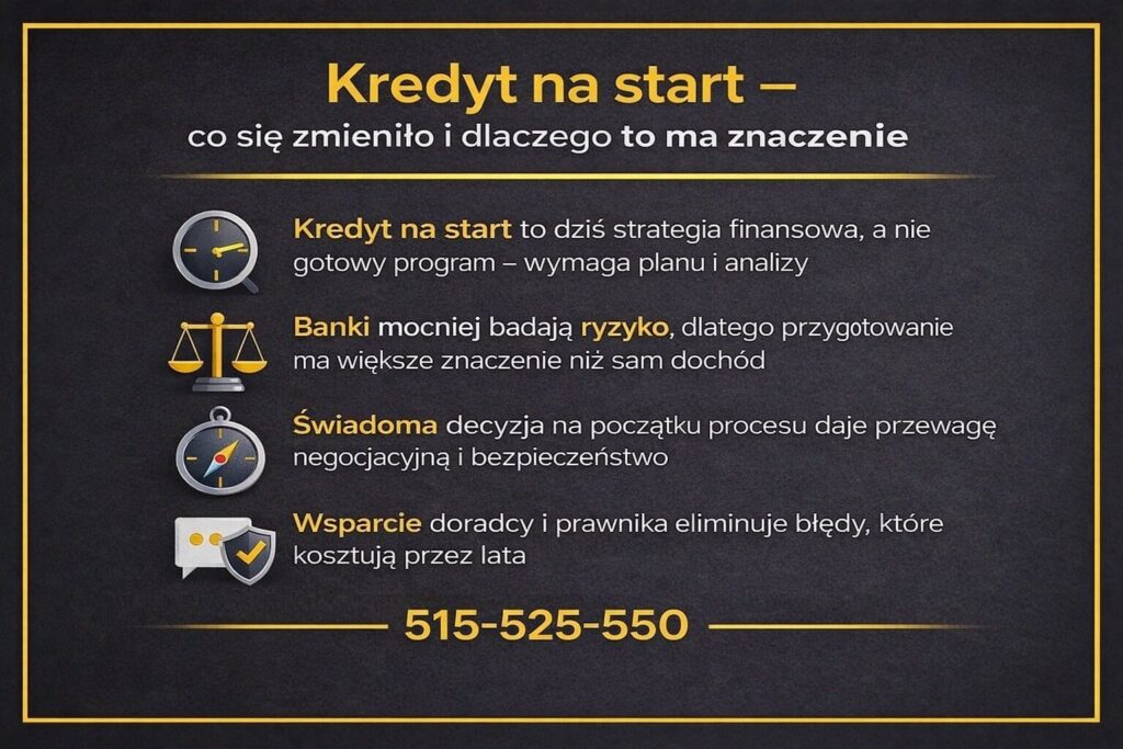 Największym błędem, jaki dziś widzę, jest odkładanie decyzji w oczekiwaniu na „idealny program”. Kredyt na start nie polega na szczęściu – polega na strategii. Dobrze przygotowany klient, wspierany przez doradcę kredytowego i prawnika, zyskuje kontrolę nad procesem, kosztami i bezpieczeństwem, zamiast reagować na decyzje banku.