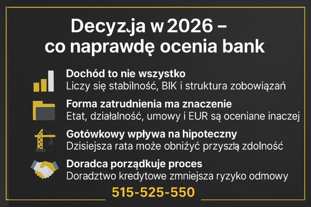 - Bank ocenia nie tylko dochód, ale też stabilność, formę zatrudnienia, historię w BIK i strukturę zobowiązań – to często decyduje o decyzji.